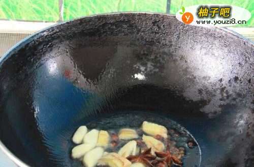 3锅烧热,倒油,量可以少一点,肥肠本身就有很多油,放入姜、蒜、香料炒香。