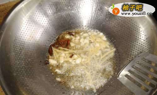 4花生油烧开,放姜、葱、蒜爆锅。