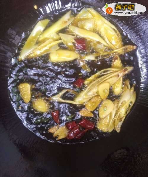 4锅中放入适量食用油,油温适宜之后加入葱白、姜片、蒜片爆香;