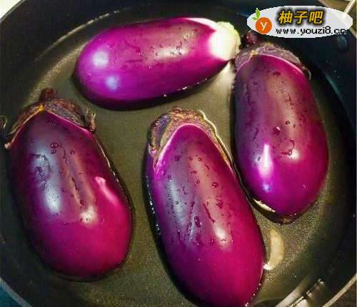 3在锅中注入约1cm高的水,皮向上放进茄子。