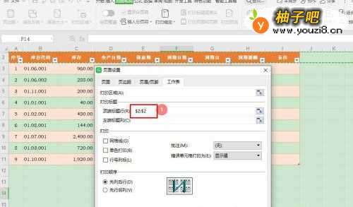 3在“页面设置”窗口,选择【工作表】选项卡——【打印标题】—【顶端标题行】;