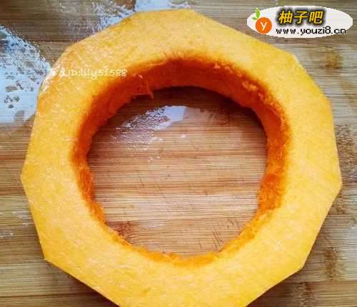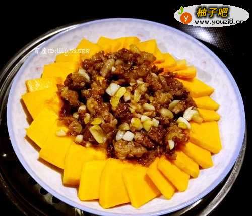 9将炒好的肉末倒在南瓜上,放入蒸锅中,大火蒸8-10分钟左右。