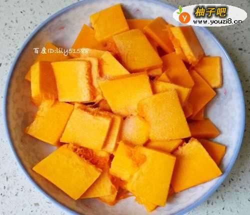 2南瓜切片,装在盘子里放入少许盐腌制15分钟。
