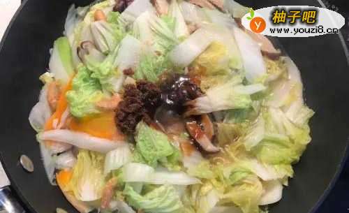 5白菜梗煮软后加入白菜叶稍微翻炒,放沙茶酱、蚝油、白胡椒等调味料和剩下的水,煮滚后调整至喜欢的咸度