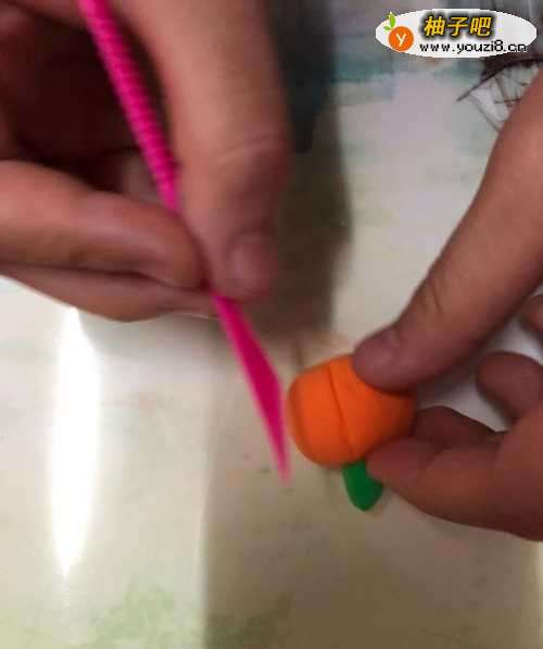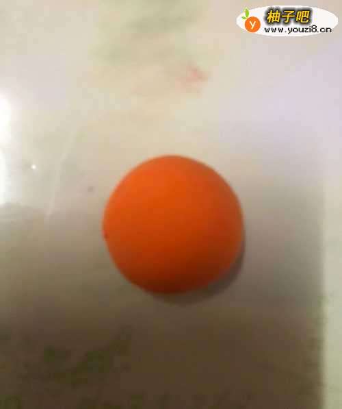 拿出橙色彩泥揉成一个大圆形,在用塑料小刀另一面在圆形上面点一下出个小窝。