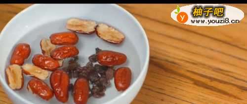 红枣去核,洗净,与葡萄一同泡在水中。