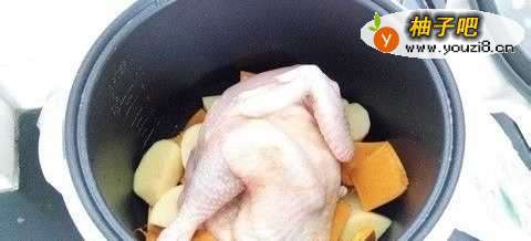 32、在电饭煲底下倒油,把土豆和南瓜铺底,上面再放鸡,这样在焗的过程中鸡汁就会流到下面的土豆和南瓜上,那土豆和南瓜就不用调味道了。接着合盖按煮饭的键,几分钟后会跳键,继续按,中途还会跳一次,这时要开盖翻炒下土豆和南瓜,再按煮饭键,第三次跳时就完成了。