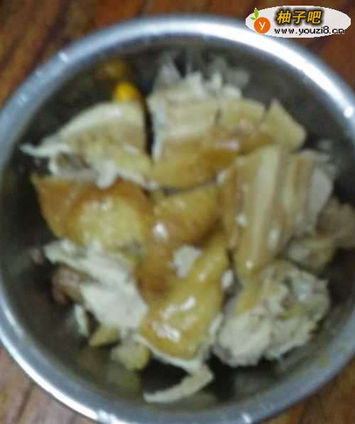 5待到高压锅下气,可以开锅以后,把鸡拿出来,放在砧板上切块。