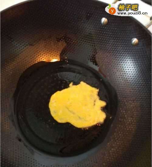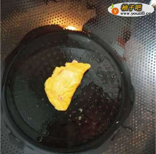 55.舀一汤勺蛋汁倒入锅底,待蛋汁铺开成圆形。(火稍微小一点,不然容易焦。)自己吃的没有做得特别漂亮,大家见谅。