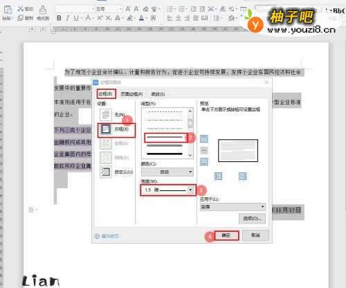 4在“边框和底纹”对话框中,选择设置【方框】——【线型】——【宽度】,然后点击【确定】;