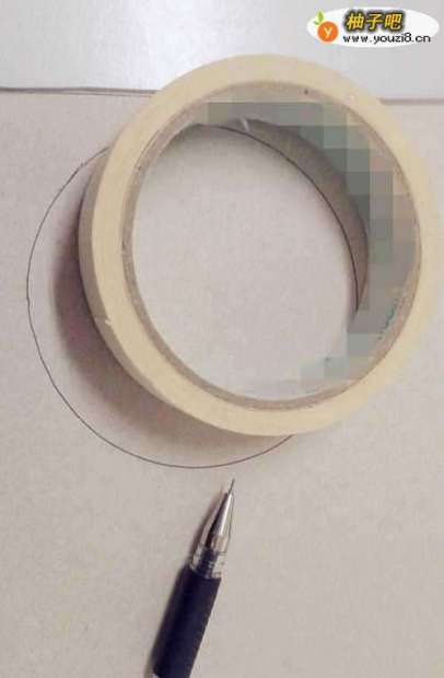 2因为没带圆规,所以要用大胶带圈画一个大圆。按住胶带圈,用笔画出一个圆。