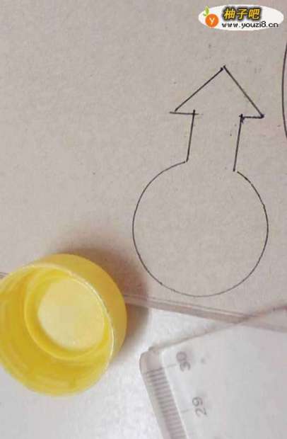 3再按住小瓶盖,画出一个小圆,并在小圆的一侧,画出一个箭头。