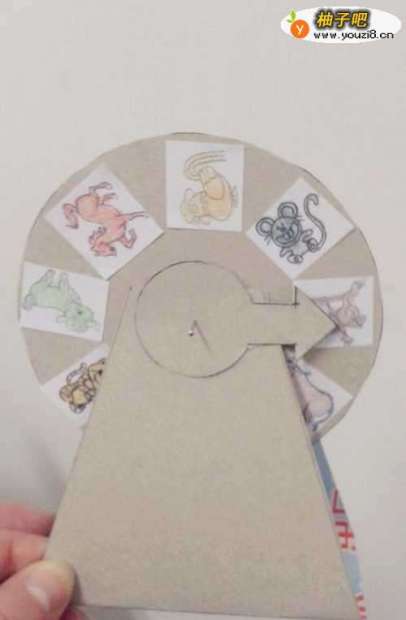 14把转盘立起来,也可以放在桌上,只要转动大圆转盘,转盘就能飞速地转起来,转盘停下时箭头所指的方向,就是转到的物品。转盘就做成了。