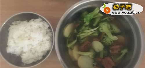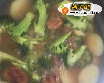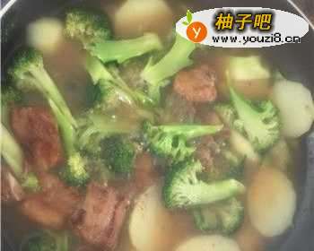 4煮5分钟以后,把西兰花和土豆倒入,搅拌均匀,一起煮5分钟。