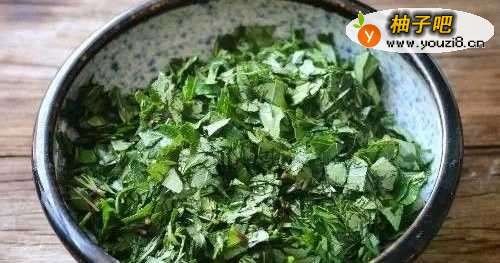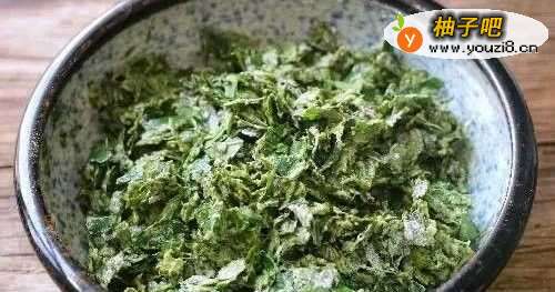 2把红薯叶切碎些,装进大一些的盆里。红薯叶中富含黏液蛋白,切的碎与不碎直接关系到下一步的操作。如果切的碎,那它的黏液会释放的多些,面粉就得多加一点。