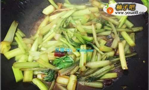 5往锅内加入一些豆瓣酱,翻炒均匀,油菜心基本熟之后,再放入前面摘下来的油菜叶,将其翻转至底部。