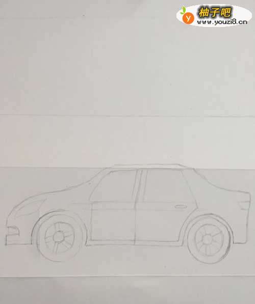3第三步 再画上汽车的车身轮廓外线 如果没有留大灯的位置 可以用橡皮擦一下
