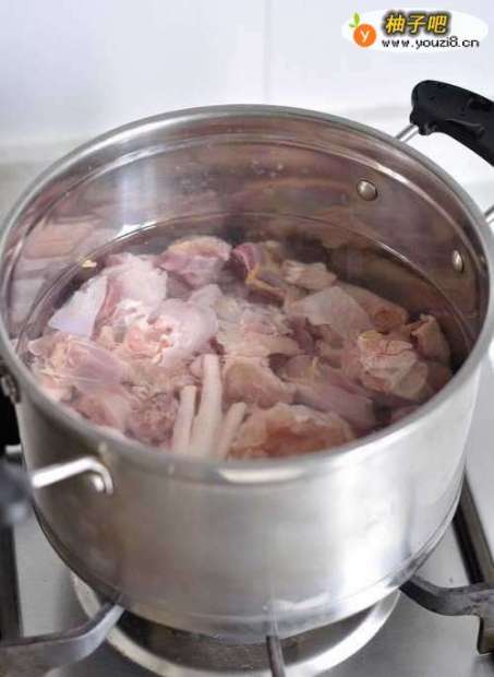 5锅里倒适量水,水烧开后转至小火,把鸡肉倒进去焯水