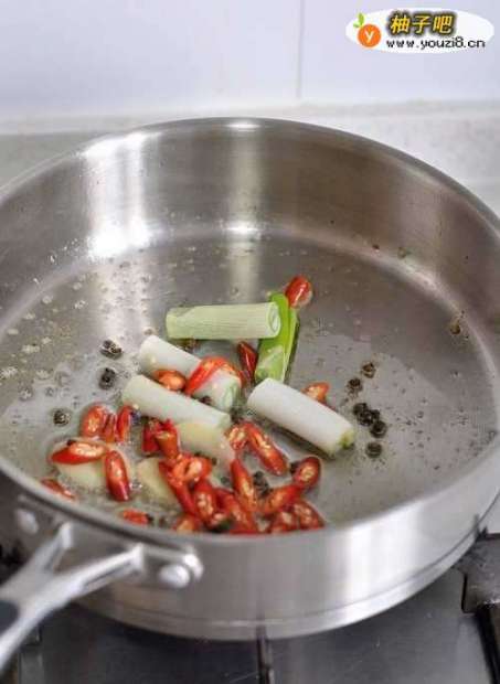 10留底油,把葱段、红尖椒、麻椒倒进去煸炒