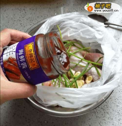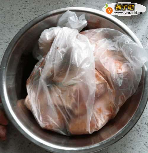 5将袋口扎紧并用用搡搓袋子内的鸡腿,以便于酱法汁均匀的分部!最后将保鲜袋放入冰箱冷藏过夜。
