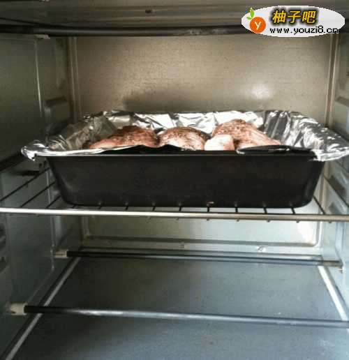 6将冷藏过夜的鸡腿取出放入垫了锡纸的烤盘!将保鲜岔孝袋内的酱汁也一并倒入盘中。