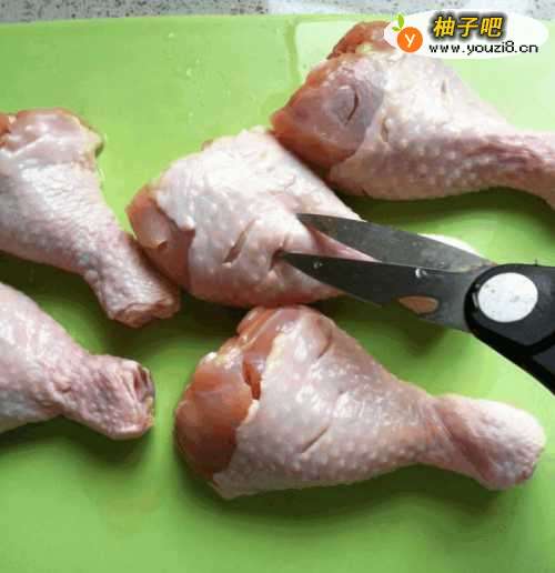 2用剪刀在每只鸡腿上剪出几道口子,便于下一步腌制的时候入味。