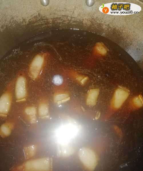 5加入适量料酒、醋、糖、盐,倒入适量老抽。