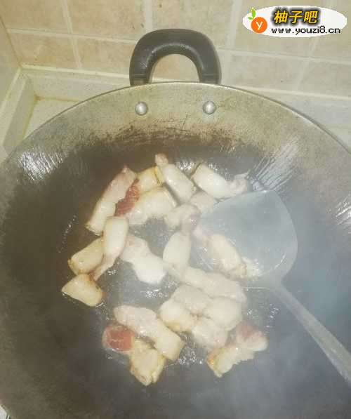 3翻炒5分钟,将猪肉榨油至黄色,香味炒出。