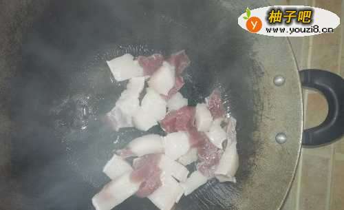 2大火将铁锅烧热,少放一点植物油,倒入猪肉煎炒。