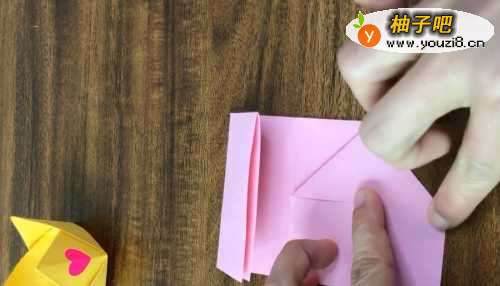 5把上面的三角形竖起,将下面的矩形的四个蓝色角向上折。