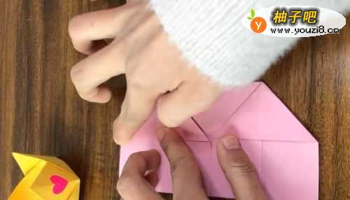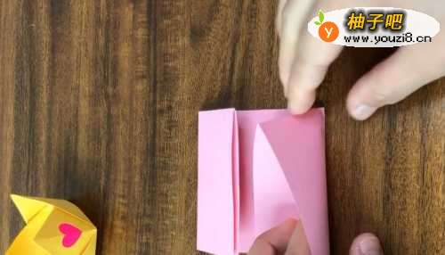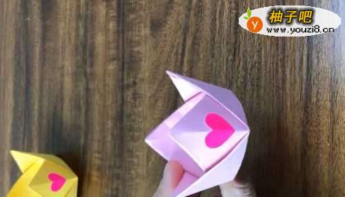 7将小小正方形的中间小心打开,用手轻轻将底部抚平成一个正方形,摆弄成一个小水槽的样子。