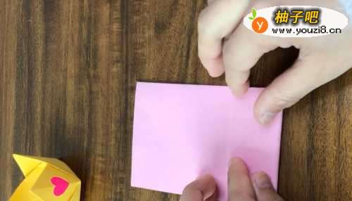 3把小正方形反过来放,小正方形的一边向着中线对折,背面的三角形不要折,而是展开。
