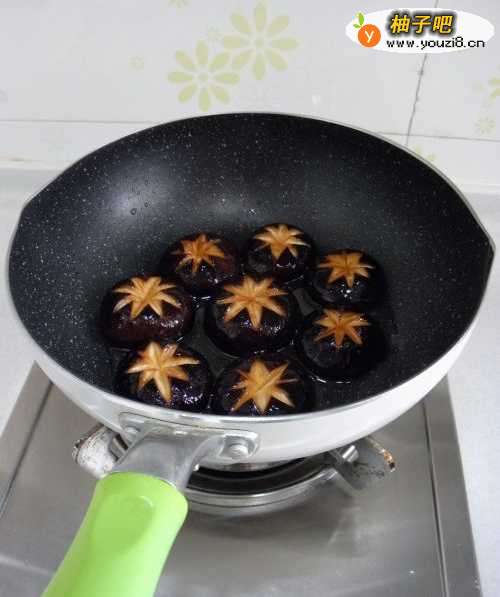 香菇洗净沥净水,用刀先将香菇蒂去掉,然后在香菇表面打花刀。打花刀的目的一个是菜品造型美观,一个是易于香菇的入味。切下来的香菇蒂和碎块,可以用来炒饭或者炒青菜。
