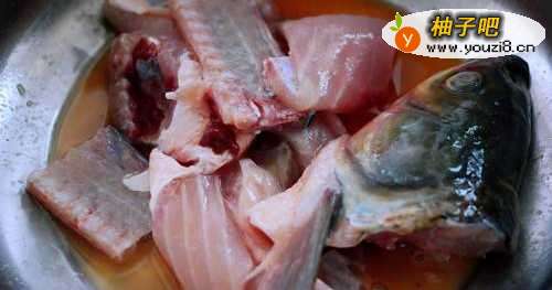 4把鱼头和鱼排也用麻辣调料包的腌制粉腌制一下。