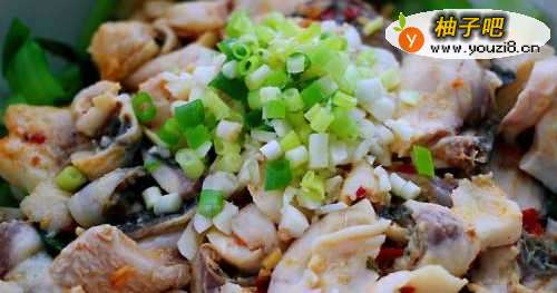 14把捞出的鱼肉片铺在鱼头和鱼排上面,撒上葱花和大蒜末。