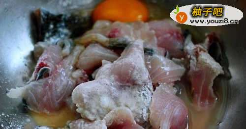 3把鱼肉片里加入麻辣水煮鱼的腌制粉,再打散一枚鸡蛋和搅拌均匀。