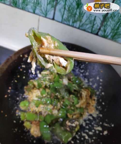 8当青椒内部的鸡蛋凝固,就可以出锅啦。如果嫌不够啦,可以加入一些细小的贼辣贼辣的小朝天椒,那辣味十足。
