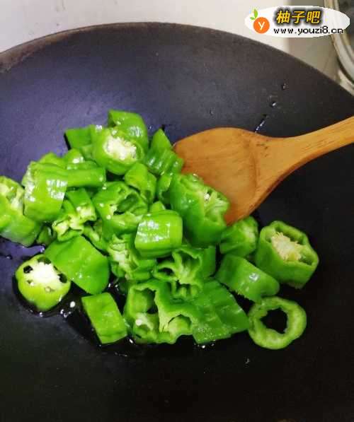 3炒锅内倒入花生油,,可以多放一些,也可中途再加。放入青椒,开中火慢慢炒。