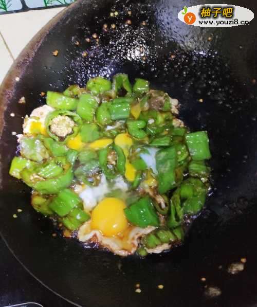 6青椒因失水,便蔫儿的时候。把青椒聚拢在一块儿,打入鸡蛋。这时不要着急翻炒,让鸡蛋在青椒的空隙之间成熟一会儿。