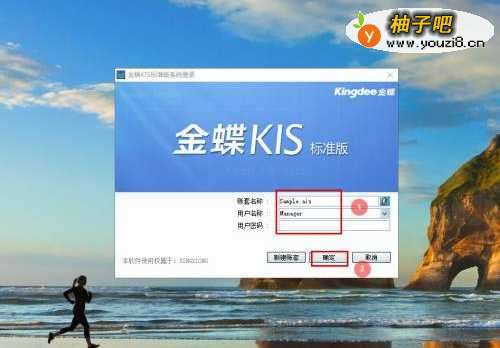 打开KIS财务软件,选择【账套】,输入用户名和密码,点击【确定】;