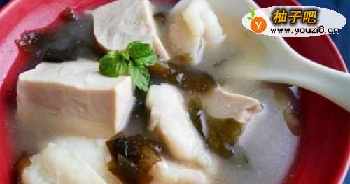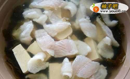 备料:冻豆腐退冰;巴沙鱼排切成小块;干燥海带芽用水泡开;味噌加少许水调开。