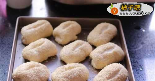 5表面薄薄刷一层水,在白芝麻里滚一下。