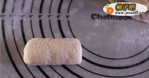 3轻拍面团排气,把面团擀成椭圆形,底部擀薄一些。