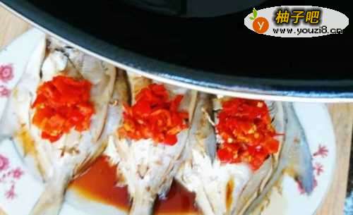 6蒸好的鱼不要着急拿出来,在锅里焖2分钟再取出,夹走鱼身上的葱姜蚂伐泥蒜,倒掉盘子里的汤汁,(汤汁一定要倒掉,不然鱼会有腥味),淋入2汤匙的蒸鱼豉油或1汤匙生抽,在每条鱼上面放一小勺剁椒。