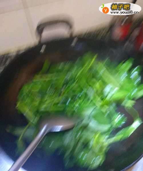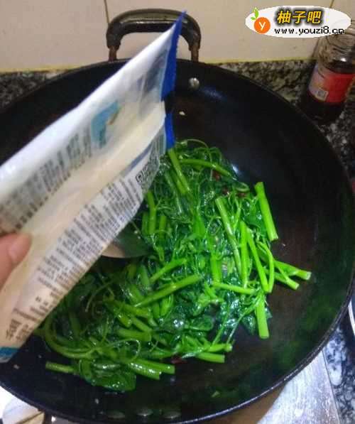 4空心菜倒入锅中,翻炒,加入盐、鸡精