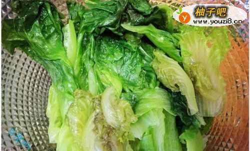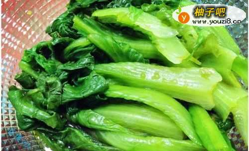 5水烧开之后,往锅内加入少许油和盐巴,将洗净的生菜放入锅内烫一阵,用筷子均匀拨动,让生菜全部没入水中,都烫熟一下。将烫好的生菜捞出,放入装有冷水的碗中冷却。