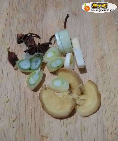2准备葱、姜、大料,葱和姜切成片待用,大料分成小块。