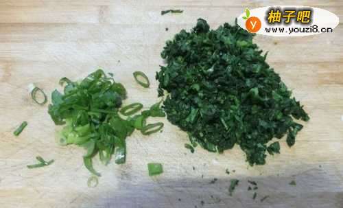 6加入芹菜叶和葱、盐、少许糖、花椒粉拌匀。