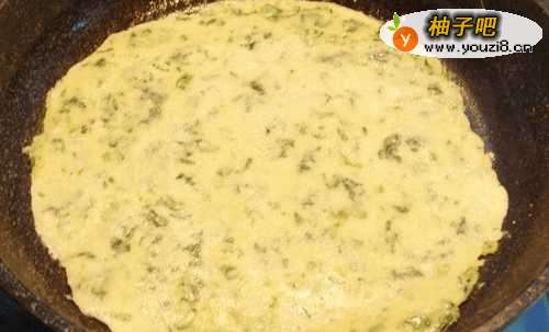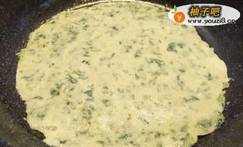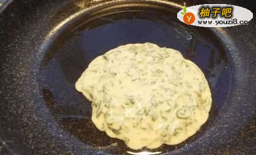 9面糊放入锅内摊开煎熟,一面煎熟翻过来煎另一面即可。