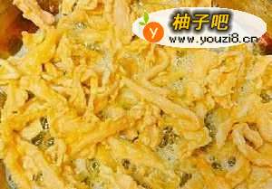 将菇条几条几条放下锅炸 一下子全放会粘连
